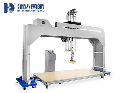 海達儀器HD-F766 康奈爾床墊耐用性試驗儀用特定的加載塊反復對床墊進行沖擊,模擬彈簧床墊在使用中遭遇人體臀部的沖擊,以評估其疲勞壽命性能和彈簧的牢固保持度。